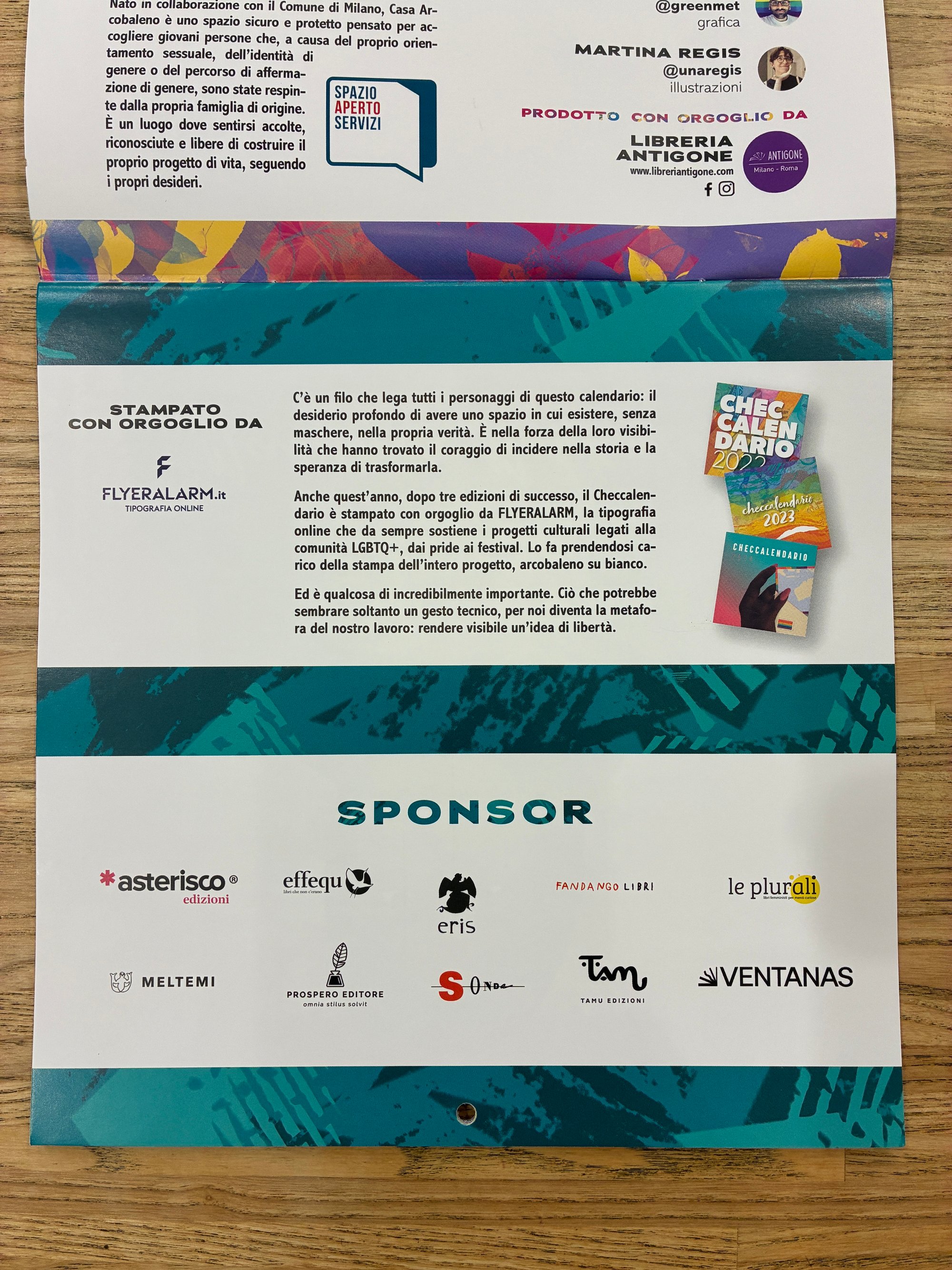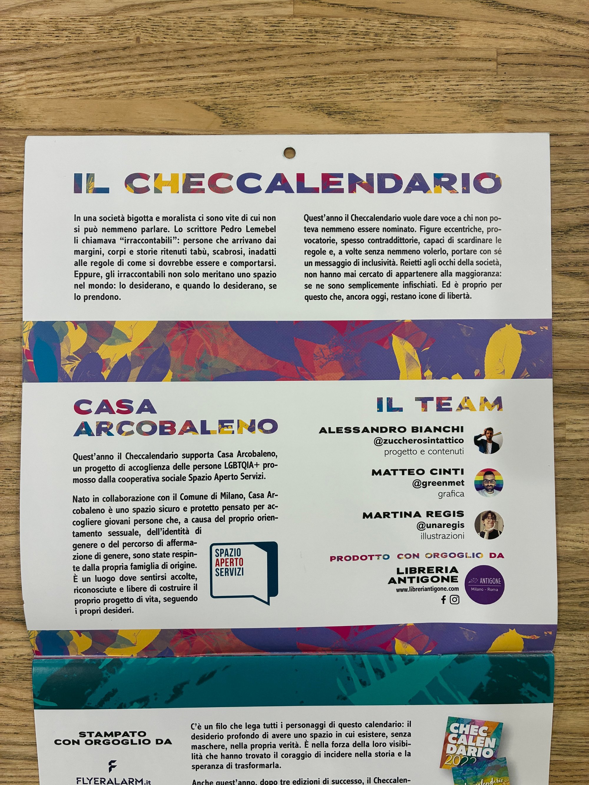 Il Checcalendario è un modo per fare qualcosa di concreto. Parte dei ricavi viene donata a Casa Arcobaleno di Milano, un progetto di accoglienza delle persone LGBTQIA+ promosso dalla cooperativa sociale Spazio Aperto Servizi. Appendere il Checcalendario in casa o sul posto di lavoro, oppure regalarlo a un* amic* o a un famigliare, significa prendere una precisa posizione contro l’omolesbobitransfobia e a favore dell’inclusività.