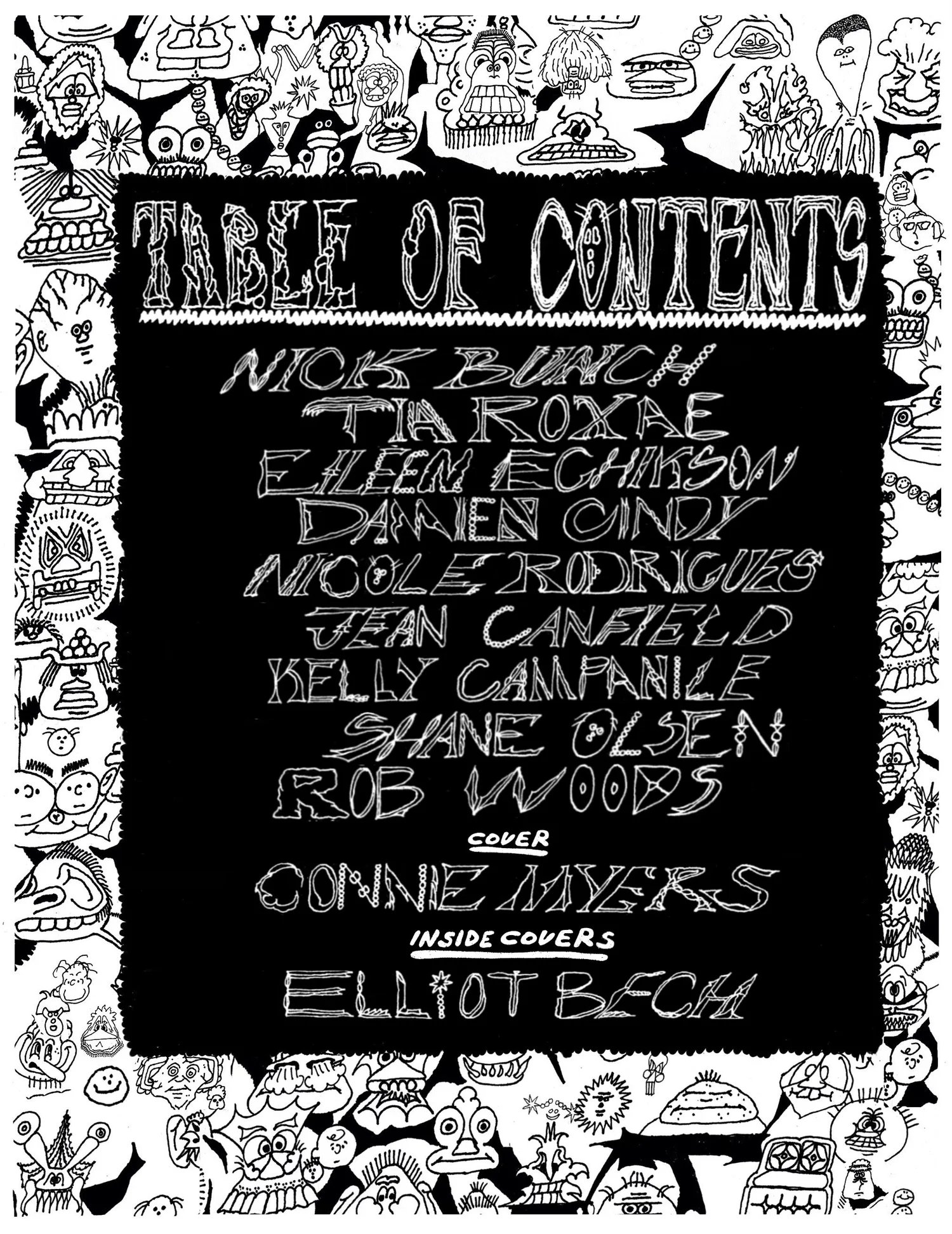 FINAL ISSUE(edited by Nick Bunch…) With a killer cover by the new Reptile House Comix EDITOR IN CHIEF Connie Myers!! 44 pages of Philly’s Phinest cartoonists! Featuring comix by Nick Bunch , Tia Roxae, Eileen Echikson, Damien Cindy, Nicole Rodrigues, Jean Canfield, Kelly Campanile, Shane Olsen, and Rob Woods. Inside covers by the one and only Elliot Bech