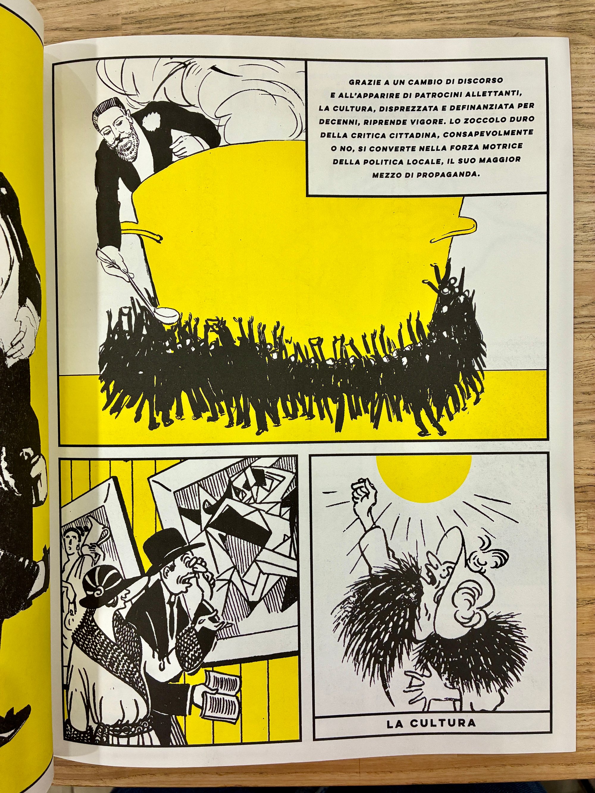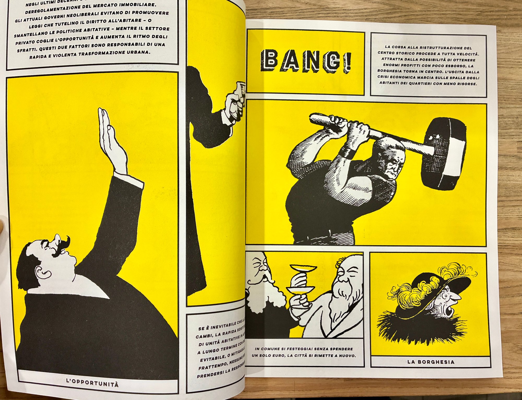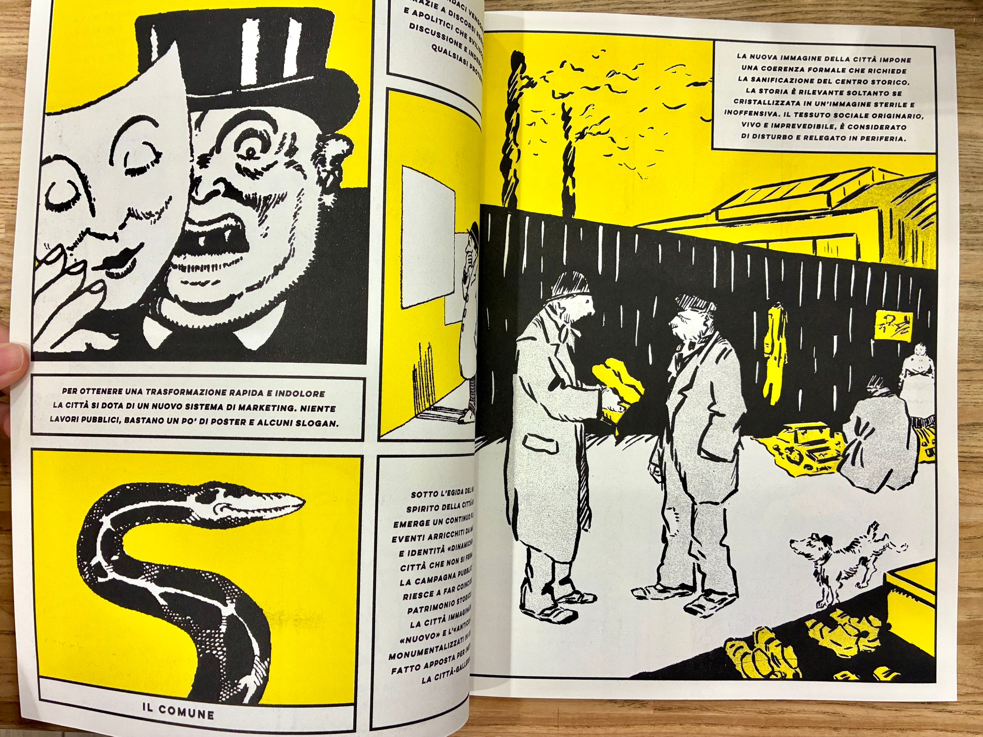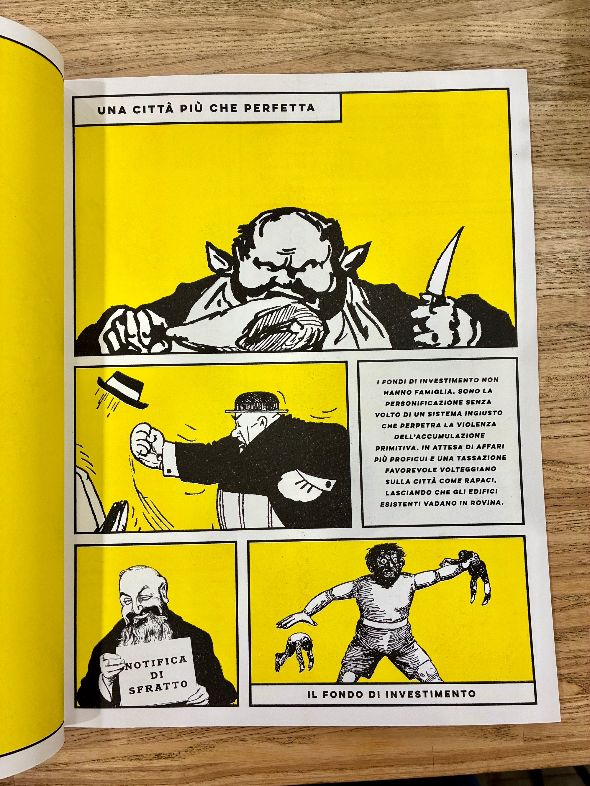 Economia turistica, trasformazioni urbane ed esperienze mistificate. Stampato originariamente da Rui Silva a Lisbona nel 2020, “Una città più che perfetta” esprime una riflessione sulle politiche abitative cittadine, sulla crescita esponenziale del turismo, e sul settore culturale. Partendo da una serie di personaggi archetipici (il padrone, il fondo di investimento, il turista e così via) personificati usando una serie di illustrazioni tratte da riviste francesi dei primi del XX secolo, il testo elabora una critica ai vari attori e al loro ruolo, più o meno consapevole, nei processi genericamente definiti “gentrificazione”.